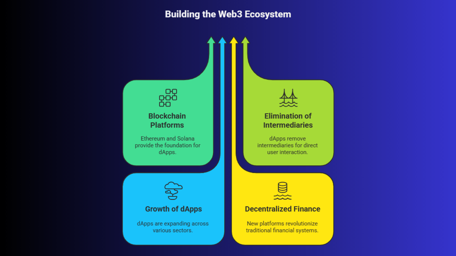 Decentralized applications (dApps) are key components of Web3, and they are built on blockchain platforms like Ethereum and Solana. dApps eliminate the need for intermediaries, enabling users to directly interact with the services they need.