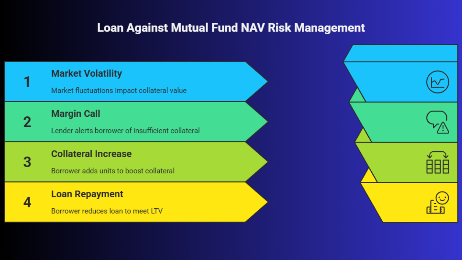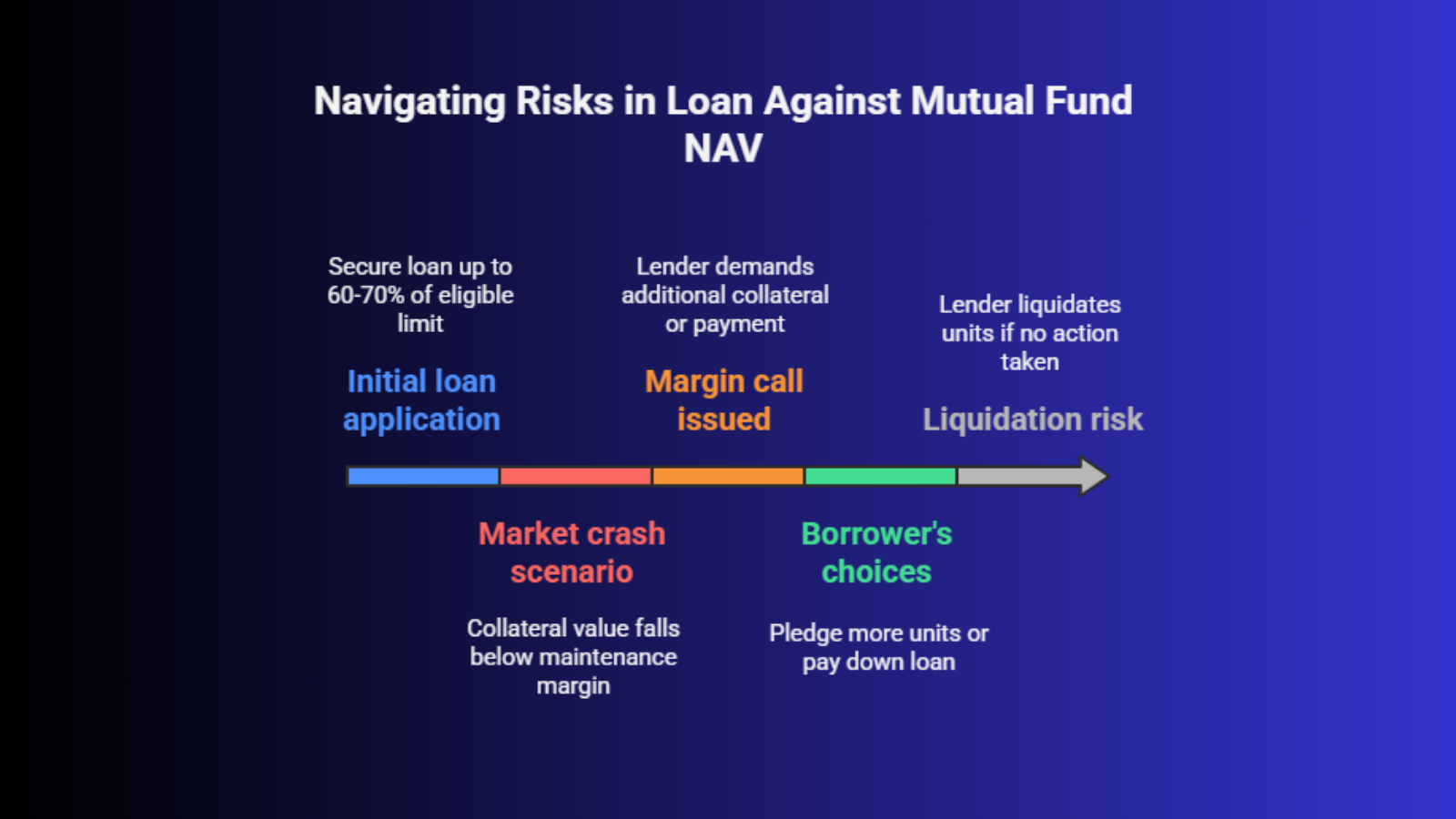 If neither action is taken, the lender has the legal right to liquidate your units at the current NAV to recover the dues. This is why it is recommended to apply for a loan against the mutual fund NAV for only 60-70% of your maximum eligible limit, leaving a buffer for market volatility.