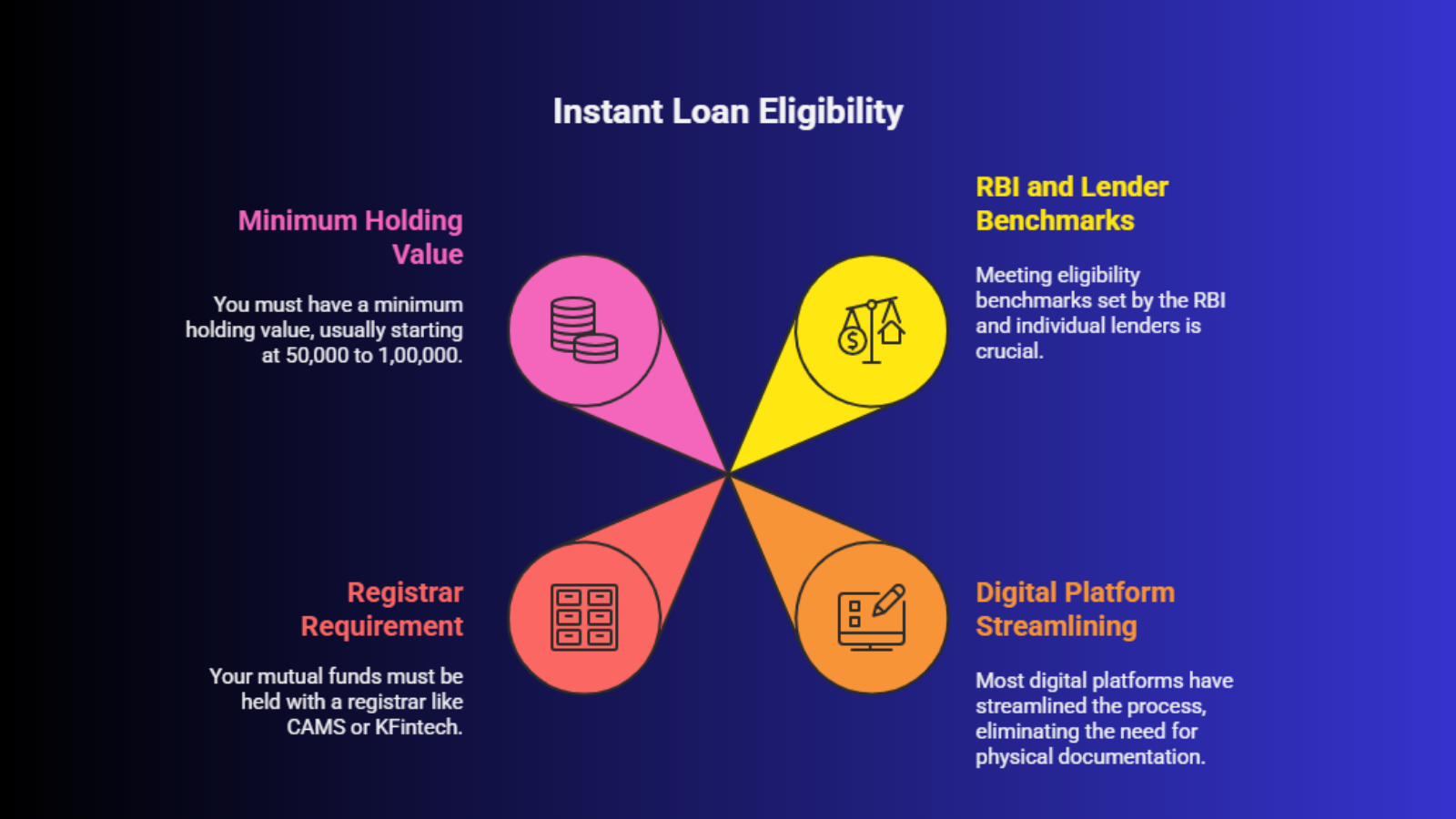 The primary requirement is that your mutual funds must be held with a registrar like CAMS or KFintech, as most lenders are integrated with these systems for real-time lien marking. Additionally, you must have a minimum holding value, which usually starts at 50,000 to 1,00,000, depending on the financial institution.