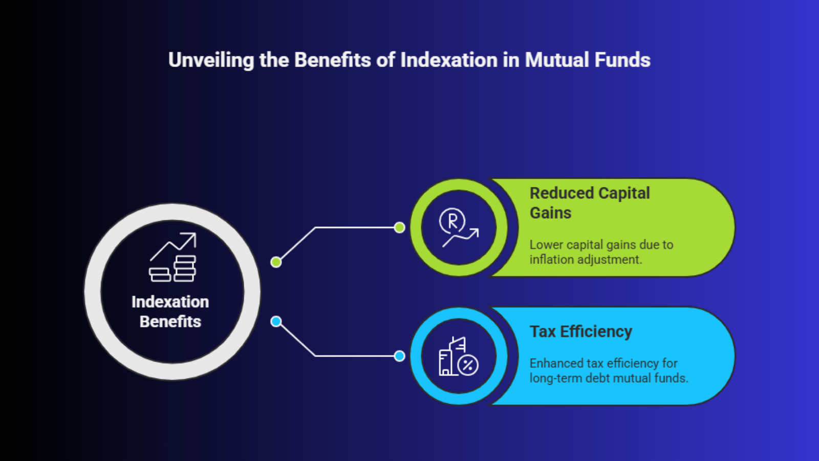 Indexation benefits apply for capital gains mutual funds from debt mutual funds. This means that you can adjust the purchase price of the mutual fund units for inflation, which reduces your capital gains and, consequently, the tax you pay. This makes debt mutual funds more tax-efficient when held for longer periods.